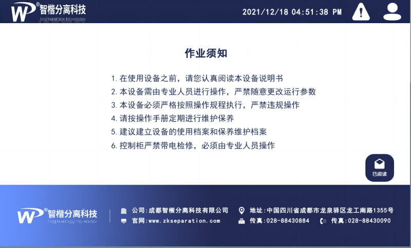 - 清洗結束后,關閉清洗閥門,離心機自動停止;