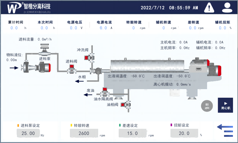 通過設定轉鼓轉速的值,主電機運行頻率自動調整,轉鼓轉速越大,分離效果越好,但轉速越高,離心機負荷越大,排渣容易不暢,根據物料濃度變化情況,適當調節轉鼓轉速的值,當離心機電機電流和副機扭矩漲幅較大時,可適當降低轉鼓轉速。
