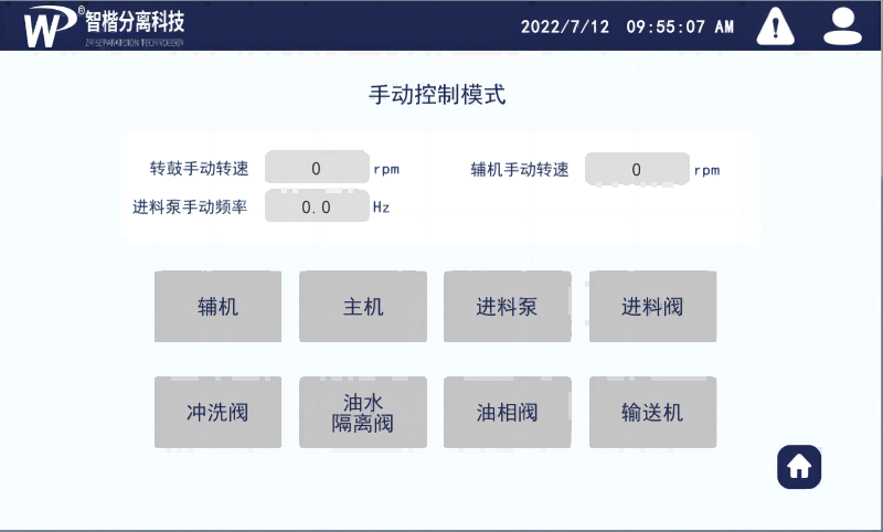 - 當離心機渣被排出來,電機電流扭矩正常后,點擊手動模式下的《 輔機 》按鈕,按鈕變成灰色,輔電機停止;