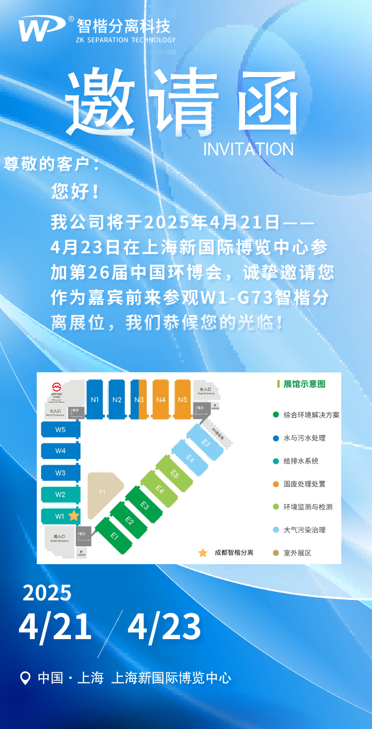 發(fā)布日期:2025-04-08我公司將于2025年4月21日 - 4月23日在上海新國(guó)際博覽中心參加第26屆中國(guó)環(huán)博會(huì),誠(chéng)摯邀請(qǐng)您作為嘉賓前來(lái)參觀 W1-G73 智楷分離展位,我們恭候您的光臨。閱讀更多 >>